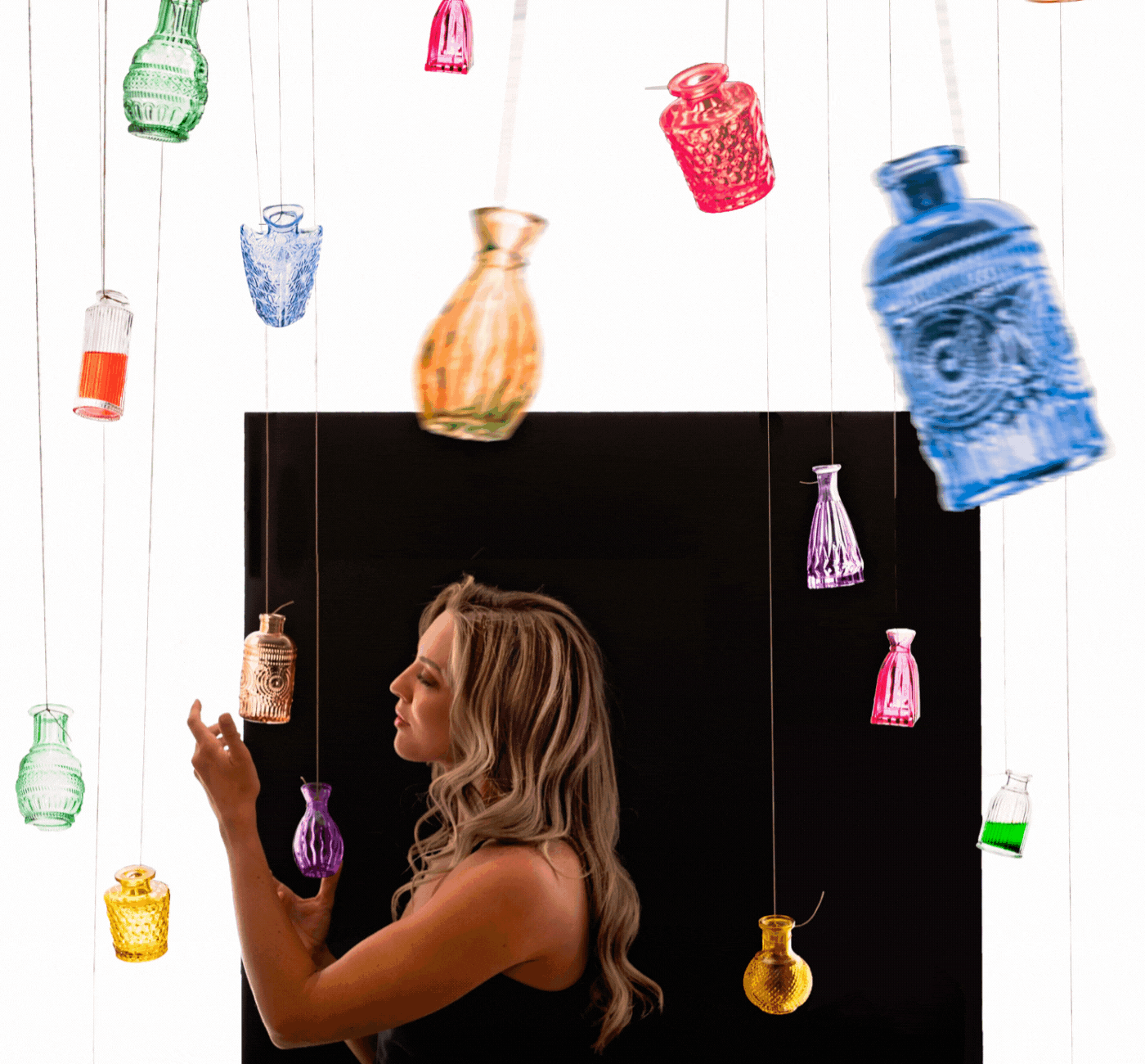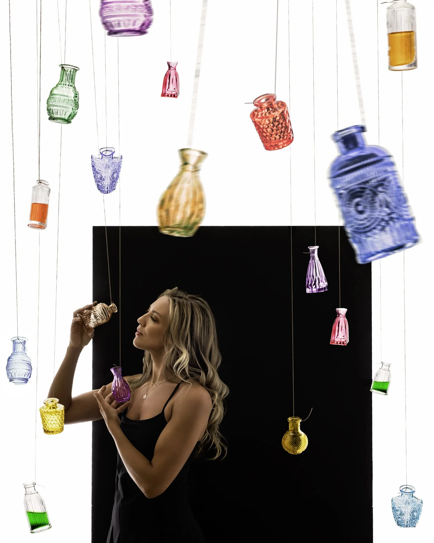 I hung rainbow bottles that I usually use to propagate plants by a C-stand. I took lots of different pictures of bottles and assembled them all in Photoshop later.